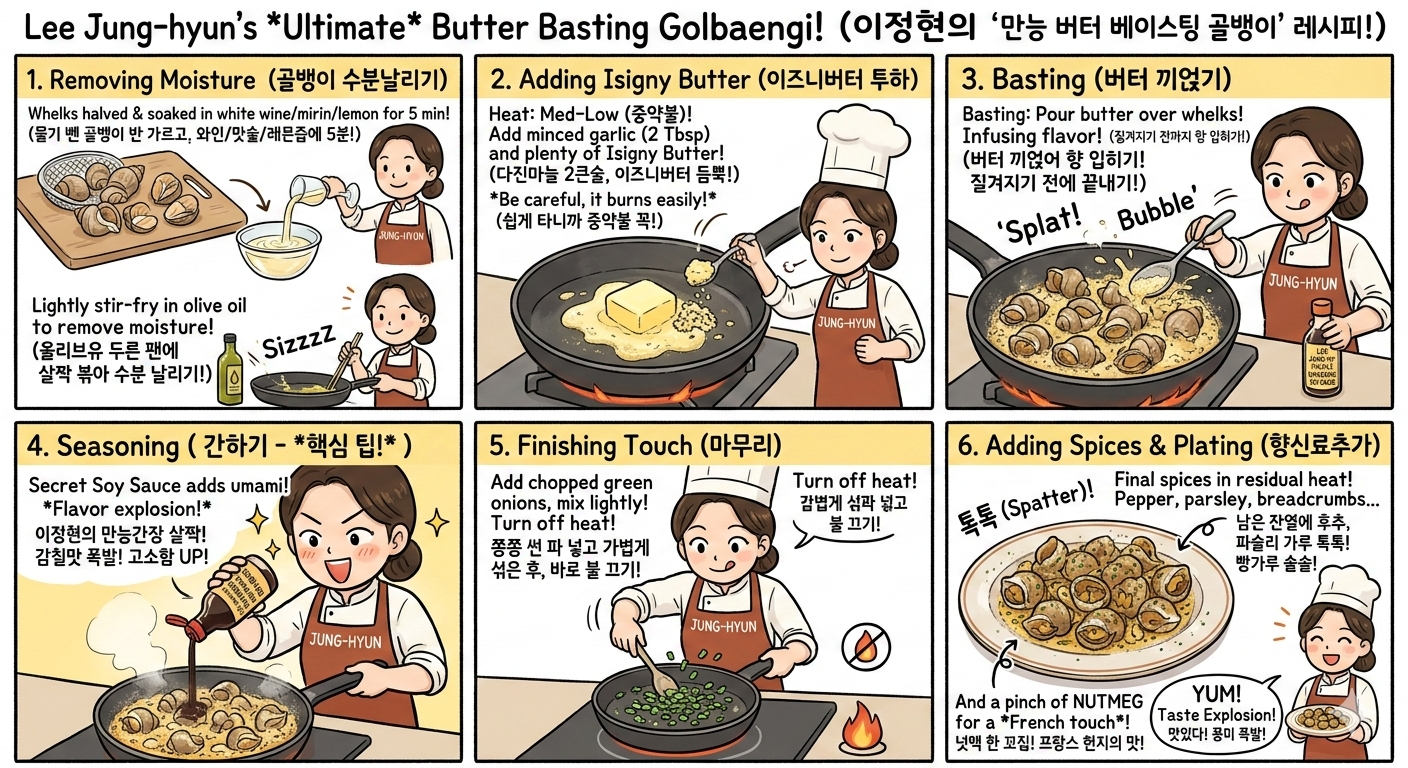 버터가 녹아 보글보글 끓기 시작하면, 스픈으로 버터를 골뱅이에 계속 끼얹어 주며 향을 입힙니다.